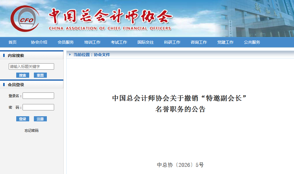 根据中央社会工作部办公厅《关于规范全国性行业协会商会名誉职务设立工作的通知》(中社办发(2025)23号文)相关要求,现决定自即日起,撤销中国总会计师协会(以下简称中总协)原设立的“特邀副会长”职务名称,同时免去经中总协第六次会员代表大会通过的相关人员的“特邀副会长”名誉职务。
